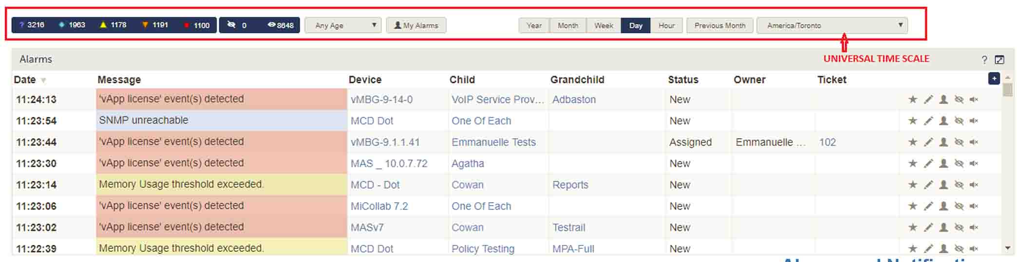 - System Alarms – generated by MPA to indicate service problem for a monitored device (ie: “iSNMP unreachable”)